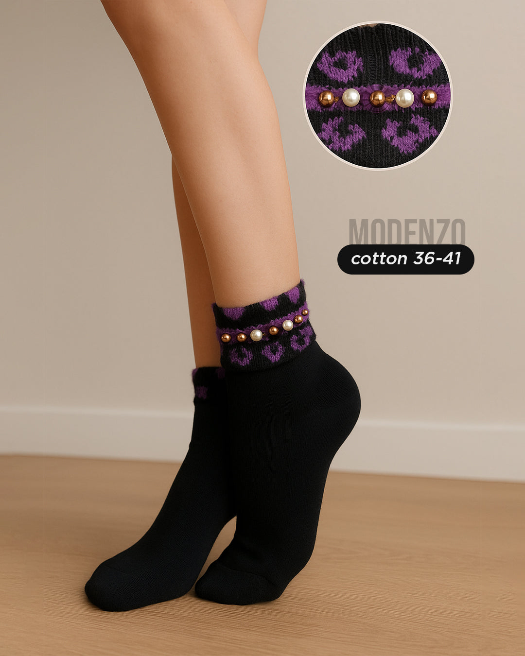 Ove crne polukratke čarape izrađene su od udobnog i kvalitetnog materijala koji idealno prijanja uz nogu, dok gornji dio krasi moderan dezen. Poseban šarm daju dekorativne perlice i zlatne kuglice, koje ovim čarapama pružaju luksuzan i ženstven izgled.