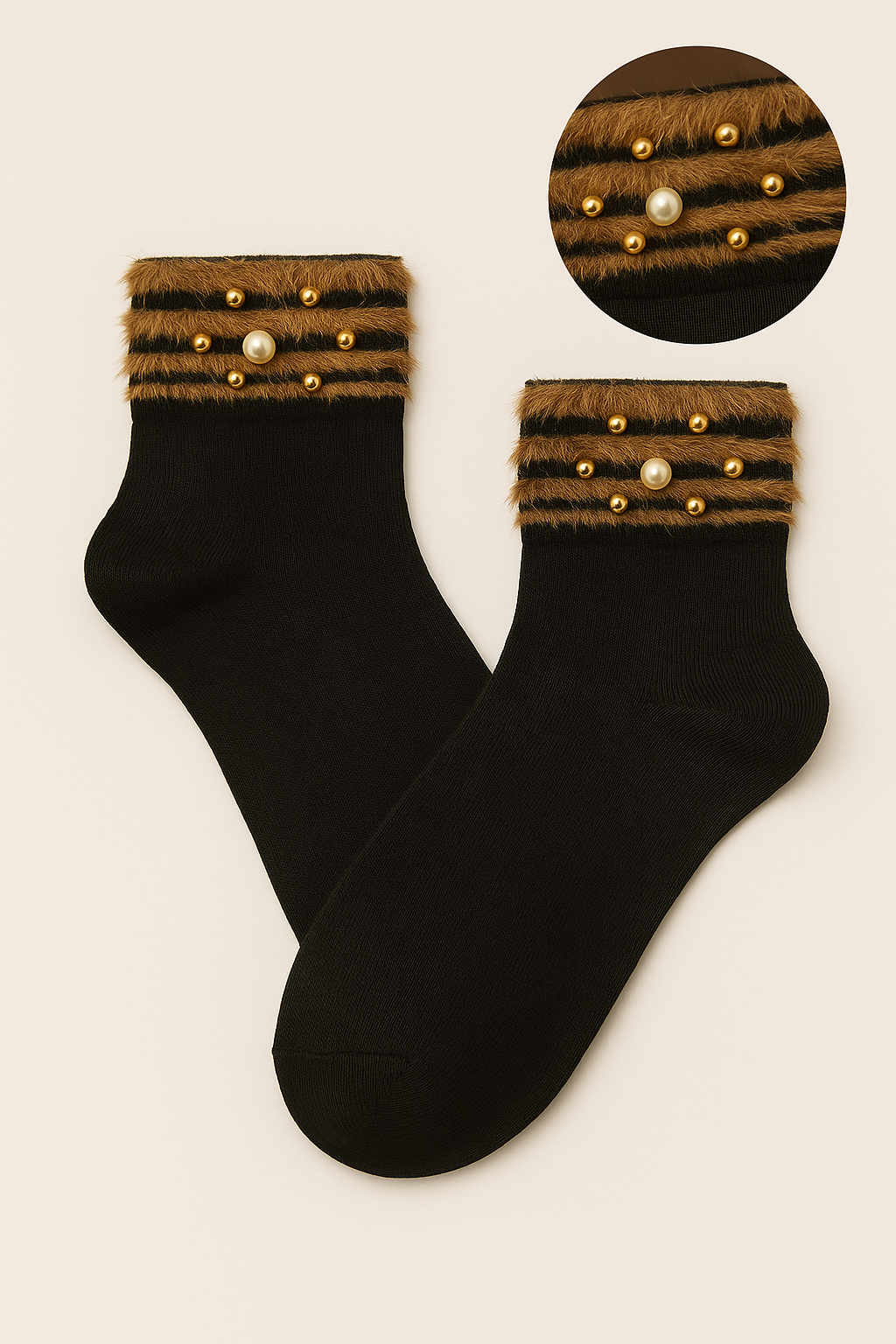 Ove crne polukratke čarape izrađene su od udobnog i kvalitetnog materijala koji idealno prijanja uz nogu, dok gornji dio krasi moderan dezen. Poseban šarm daju dekorativne perlice i zlatne kuglice, koje ovim čarapama pružaju luksuzan i ženstven izgled.