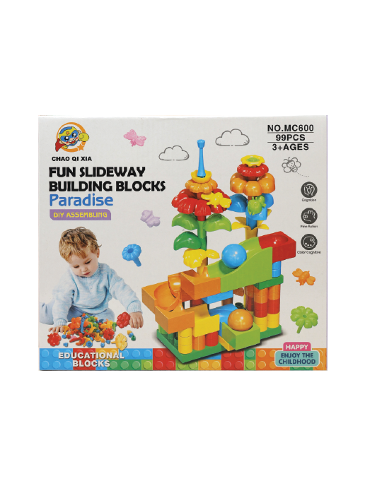 Ovaj edukativni set kocki sjajan je za djecu uzrasta 3+ godine. Sastoji se od 99 dijelova koji se lako slažu i omogućavaju pravljenje raznih staza za loptice, tobogana i kula iz mašte!